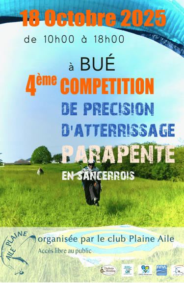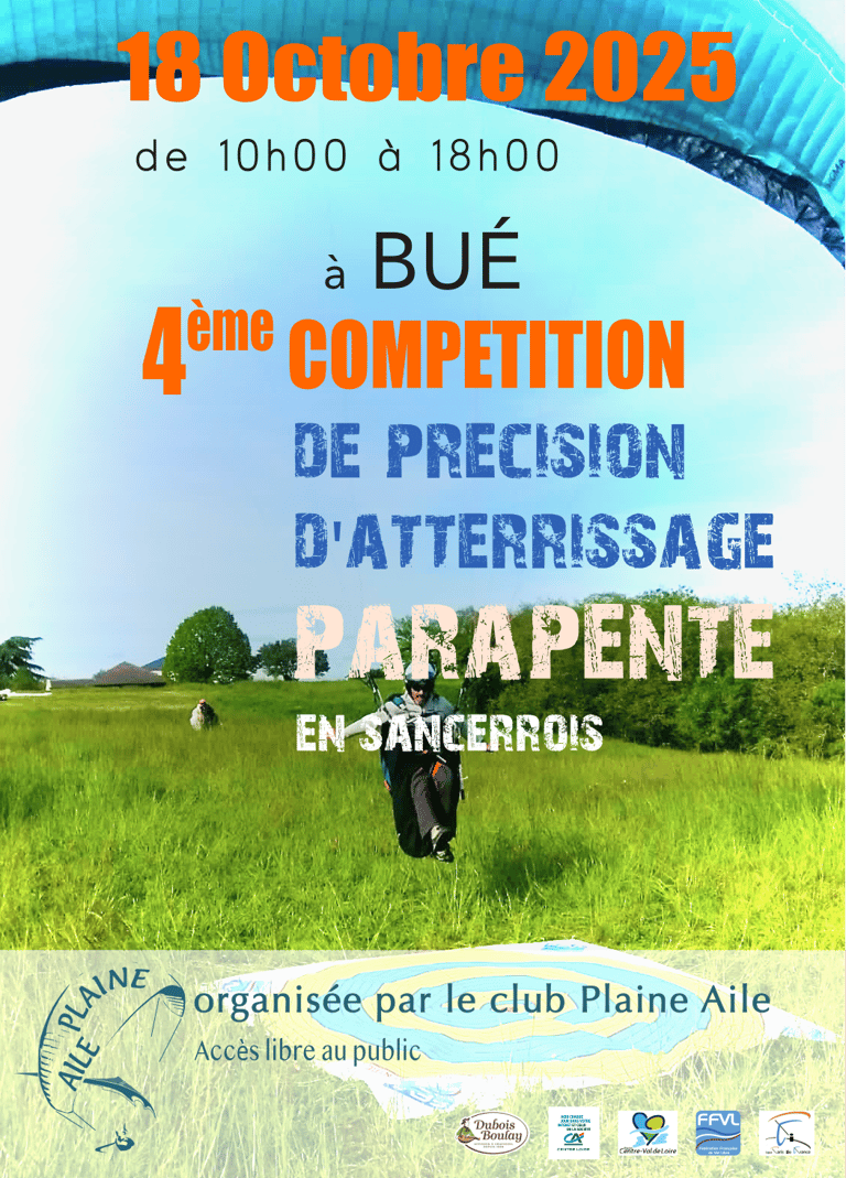 Le 18 octobre 2025, le club Plaine Aile organise sa quatrième compétition de précision d'atterrissage en sancerrois. Les pilotes sont mis en l'air à l'aide d'un treuil. Ils doivent rallier l'atterrissage où une cible est installée et poser avec précision en visant le point central de la cible. Activité ludique, ce type de compétition donne lieu à des joutes amicales, mais aussi de travailler le pilotage près du sol. Inscriptions à l'adresse :