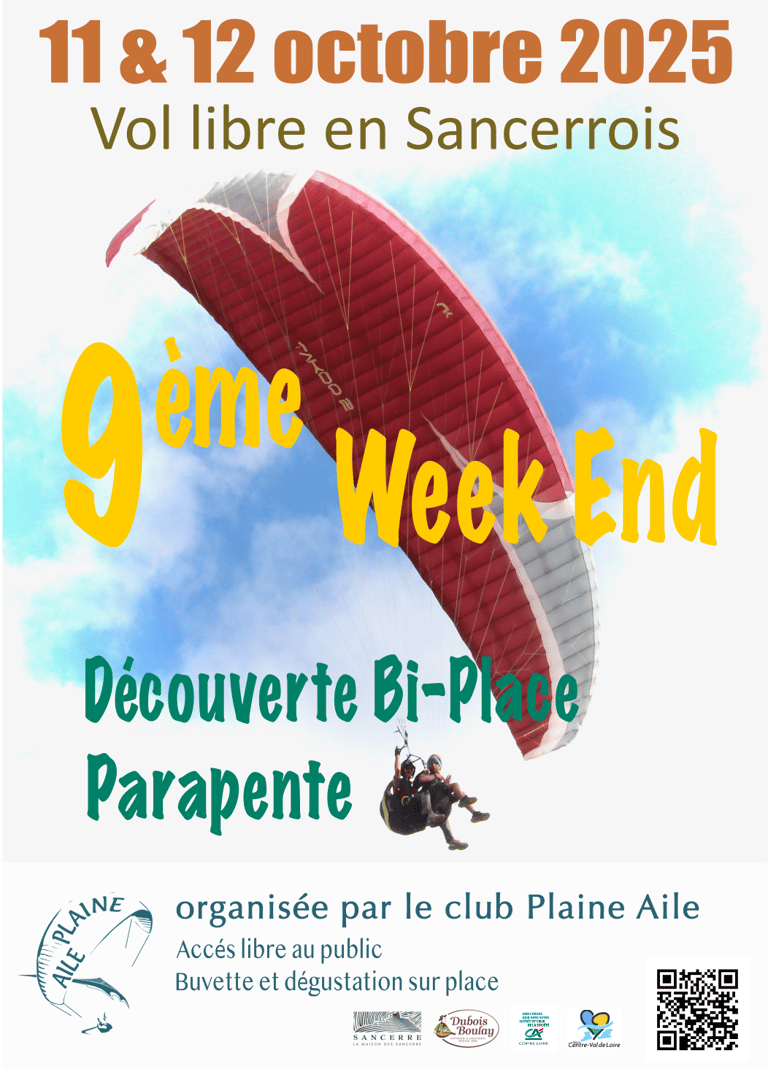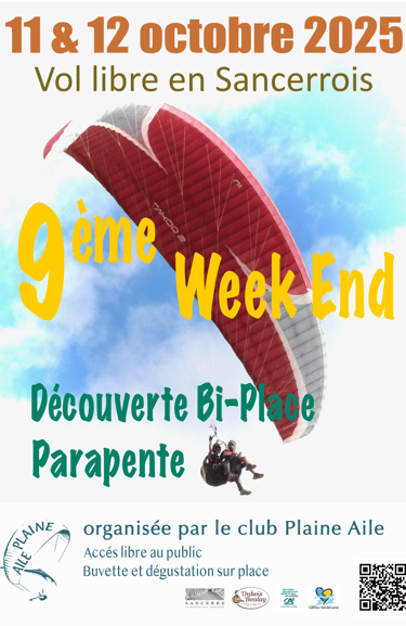 Le 11 et 12 octobre 2025, le club Plaine Aile organise un deuxième week-end de découverte du vol libre en parapente biplace. Les pilotes biplaceurs du club accueilleront à cette occasion le public désireux de réaliser un vol en tandem. Le lieu de l'évènement sera communiqué la veille. Une buvette sera installée pour patienter en attendant son passage. Réservation et renseignements à l'adresse : contact@plaineaileparapentesancerrois.fr
